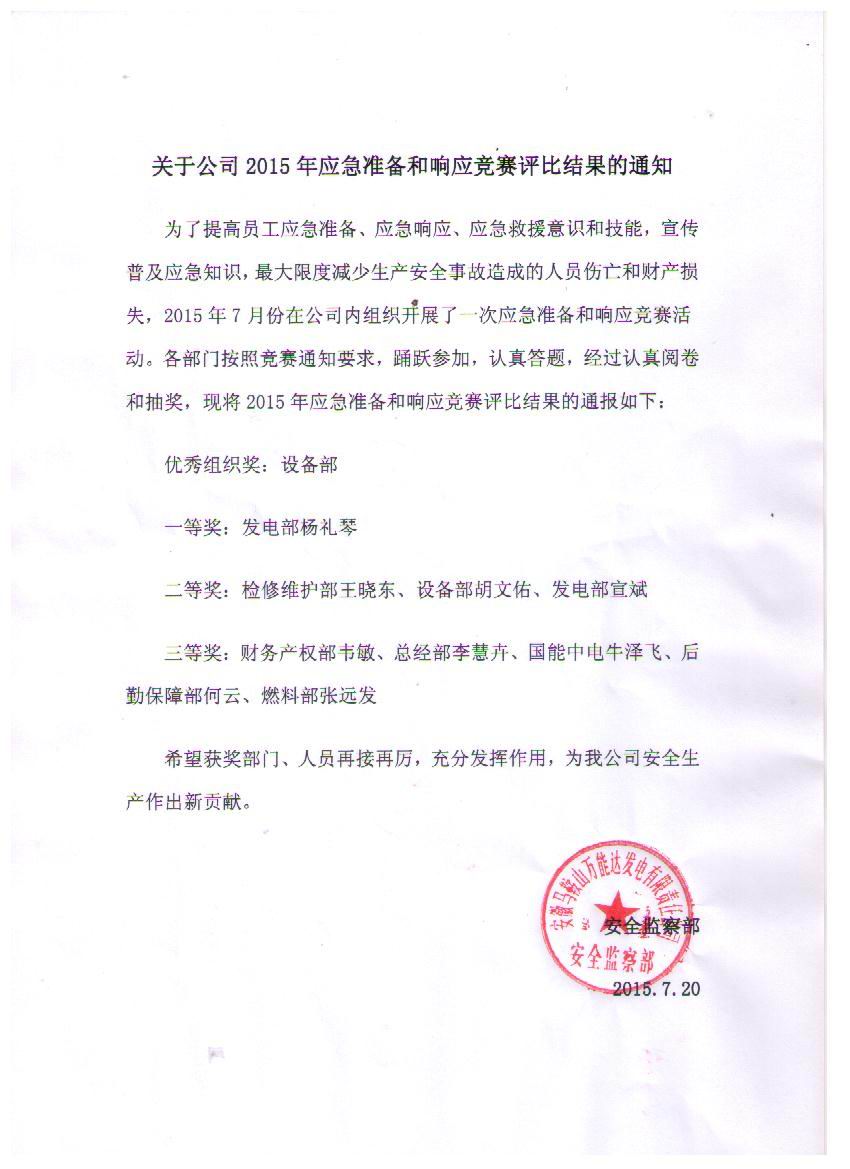 為了提高員工應(yīng)急準(zhǔn)備、應(yīng)急響應(yīng)、應(yīng)急救援意識和技能,宣傳普及應(yīng)急知識,馬鞍山項(xiàng)目部業(yè)主萬能達(dá)電廠于2015年7月組織開展了應(yīng)急競賽,我公司牛澤飛獲得三等獎,牛澤飛是獲得獎項(xiàng)的唯一非電廠員工,牛澤飛的獲獎及展示了公司風(fēng)貌,又體現(xiàn)項(xiàng)目的安全教育頗有成效,既了強(qiáng)化了員工的安全意識,也提高了員工處理應(yīng)急突發(fā)情況的能力。